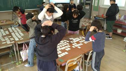 3つのグループ(4〜5人ずつ)に分かれて札を取り合っています。今回は個人戦としておこなっています。