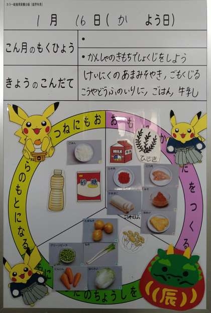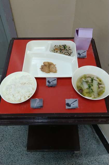 今日は小おかずに「高野どうふのいり煮」が提供されています。高野どうふはよく見かける直方体ではなく、はじめからパウダー状となったものを使用しています。
