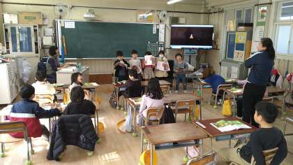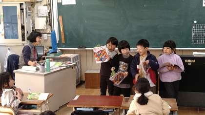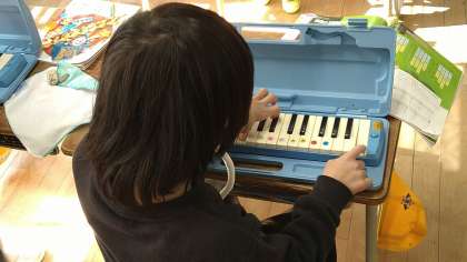 歌は「もりのくまさん」の輪唱をしています。前に4〜5名の子どもたちが出て歌い、座っている子どもたちが追いかけて歌っています。鍵盤ハーモニカは「きらきらぼし」を演奏しています。