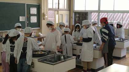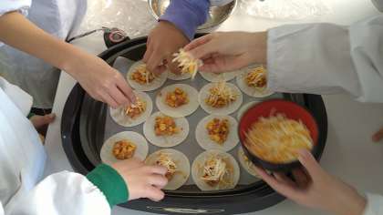 今回はメイキングとして簡単な調理実習をおこなっています。メニューは「変わりピザ」です。給食でもおなじみのメニューです。ホットプレートを使って調理しています。