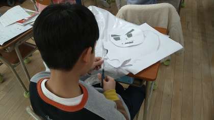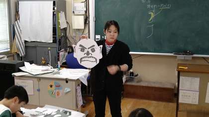 テーマは、「自分の中にいる鬼をやっつけろ」です。この時間は、耳と角(つの)を付けています。色々な表情の鬼たちがいます。