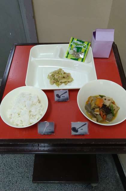 今日は大おかずに「筑前煮」が提供されています。具材は、鶏肉・れんこん・ごぼう・こんにゃく・にんじん・しいたけ・さんどまめとたくさん使っています。