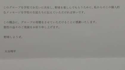 本日の午後、ロサンジェルス・エンゼルス・オブ・アナハイム(現ロサンジェルス・ドジャース)のメジャーリーガーの大谷翔平選手からメッセージとともに、グローブが届きました。