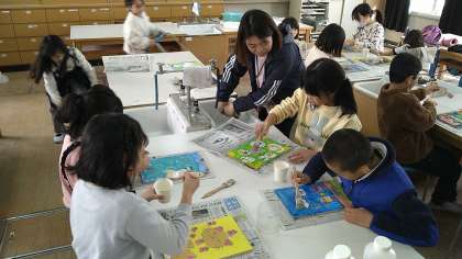 前時までに台板にかいたデザインに絵の具で色を塗リました。今日はその台板にニスを塗っています。ニスは複数回塗って仕上げています。