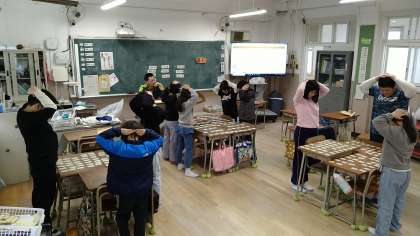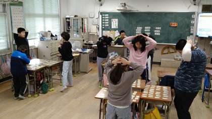 今日は3つのグループに分かれておこなっています。どこのグループになるかはくじで決めています。後ろの黒板には、子どもたちがどれだけ覚えられたかがわかる表が貼られています。