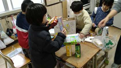 家庭で集めた色々な形・大きさの箱やトイレットペーパーやラップの芯組み合わせています。動物を作っています。