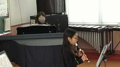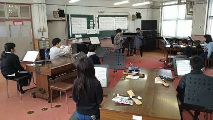 曲名は「こきょうの春」です。「気持ちを合わせて美しいひびきでえんそうしよう」がめあてとなっています。低い「ド」の音をふくことを難しそうにしています。