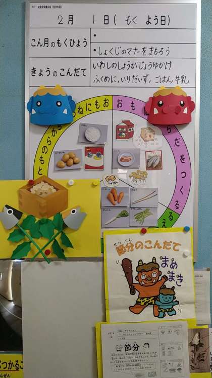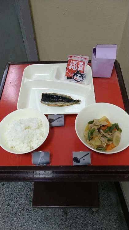 今日の献立は「節分の行事献立」となっています。「いわしのしょうがじょうゆかけ」と「いり大豆」が提供されています。