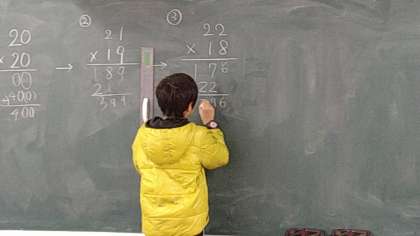 20?20の筆算から始まり、21?19、22?18、23?17と順に計算しています。かけられる数が1ずつ増え、かける数が1ずつ減る問題です。答えを予想しながら解いています。