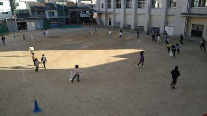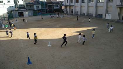 毎週水曜日は、3・5年生が運動場を走ります。カラーコーンを2重のコースになるように置いて内側が3年生、外側が5年生が走っています。