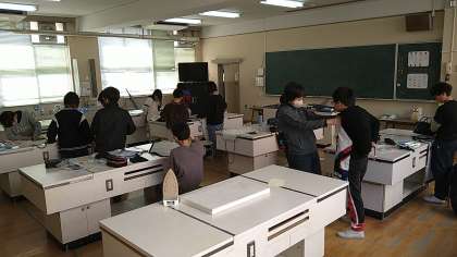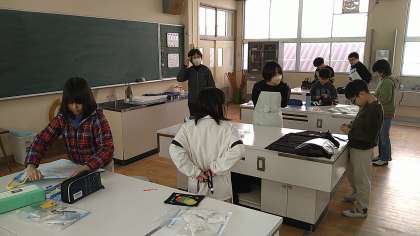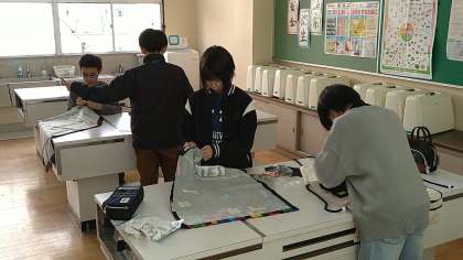 作業はかなり進んでおり、最後のひも通しを始めている児童も見られます。あとは、ポケットをつければ完成となります。