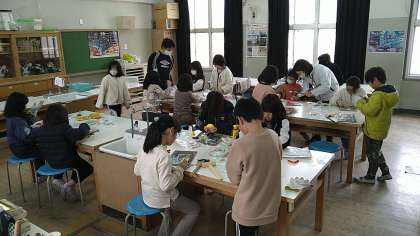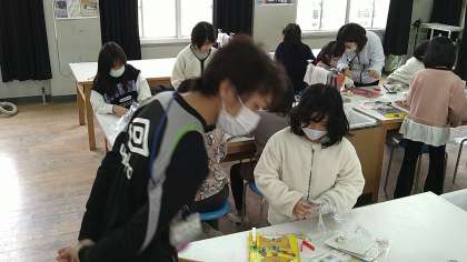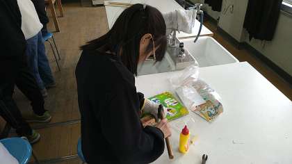 色を塗り、さらにニスを塗った台板に釘を打っています。けがをしないための釘を支えるための道具がついています。また、片手には軍手をつけています。