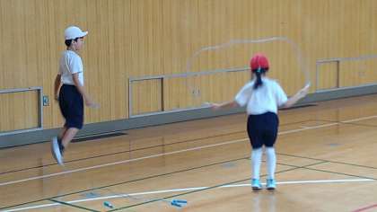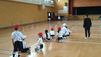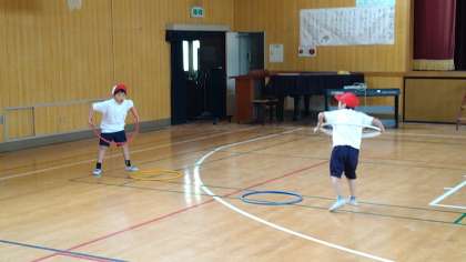 これまでに学習してきたことを連続してできるサーキットコースにしてペアで運動遊びをしています。