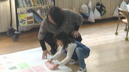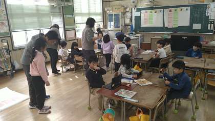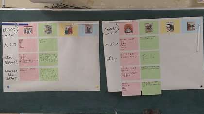 模造紙に4つの昔話についてまとめています。4つの昔話は「ももたろう」「さるかに」「こぶとり」「かもとりごんべえ」です。調べたことをそれぞれの模造紙に貼っています。