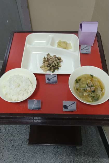今日の小おかずに「豚肉と干しずいきのみそ煮」が提供されています。ずいきは「芋茎」と書き、サトイモやハスイモの茎です。食感を楽しめるように仕上げられています。