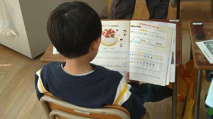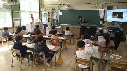 たのしいポケット歌集の中の曲を歌ったあと、教科書の「フルーツケーキ」を歌っています。この曲は「ことばのまねっこであそぼう」というめあてがあり、同じ歌詞を続けて真似をしています。