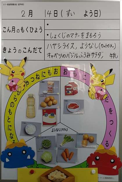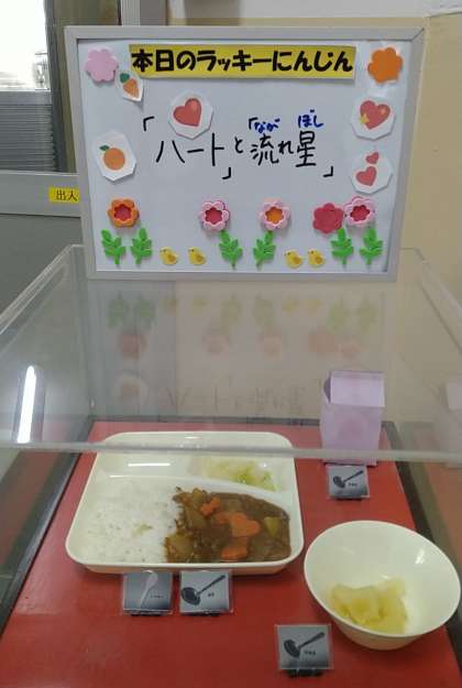 今日のメインは「ハヤシライスです。」今日のハヤシライスのにんじんは「ラツキーにんじん」となっています。今日の型は、「ハート」と「流れ星」です。