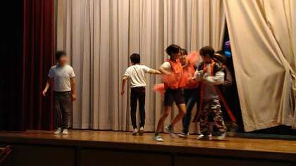 体育館で明日おこなう劇のリハーサルをしています。