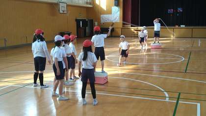 初めに、長なわを使ってかぶりなわの連続(8の字跳び)をしています。連続は30回程度続きました。