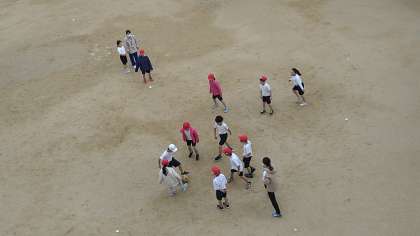 運動場で持久走とボール蹴りゲームをおこなっています。