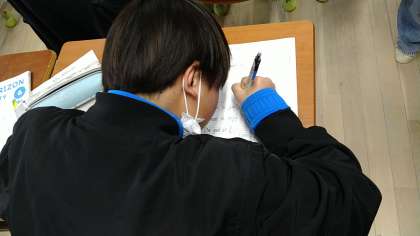 スピーチの文章作りをしています。内容は、「私の1番の思い出」「中学生に向けた抱負」などを考えてワークシートに書いています。