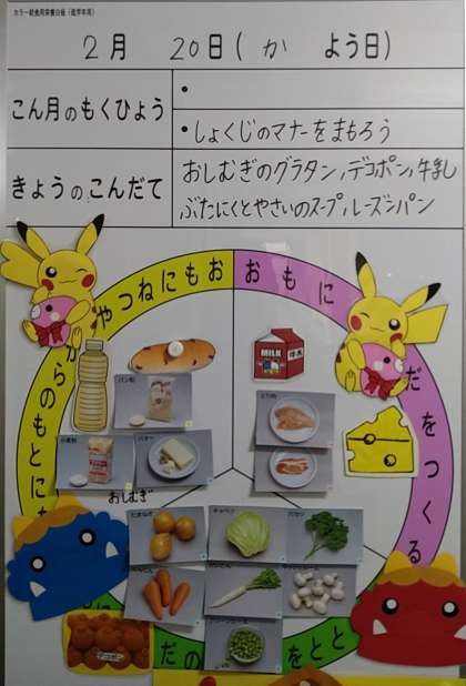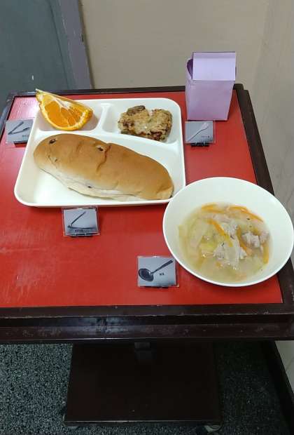 小おかずに「押麦のグラタン」が提供されています。最後は焼き物機で焼かれています。表面は適度にお焦げができた仕上がりになっています。