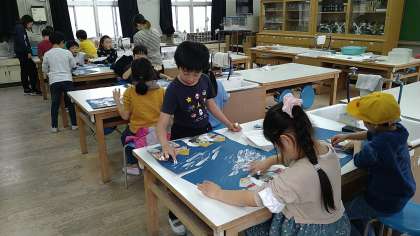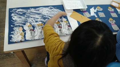 教室で制作した「かさこじぞう」に雪景色を重ねています。吹雪や積もった雪は液体粘土を使って表現しています。