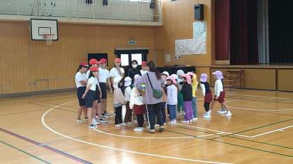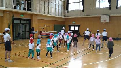体育館で幼稚園・保育所・保育園の子どもたちとドッジボールをしています。