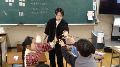 長方形(面)の数が何枚なのか。どんな種類の長方形がいるのか。辺が何本あるのか。などを模型を使って考えています。