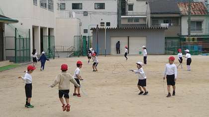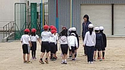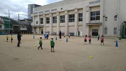 ボール蹴りゲームを楽しんでいます。チームで作戦を考えています。作戦どおりにいくかどうかはまだわかりませんが、1年生から考えて取り組むことを大切にしています、