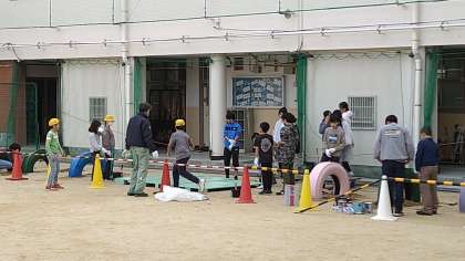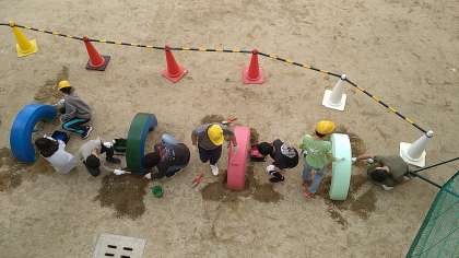 今年は、少し前に運動場の側溝を掃除しました。今日は、馬跳びをするためのタイヤとなわ跳び用のジャンピングボードのペンキの塗替えをしています。