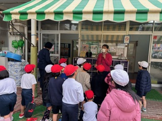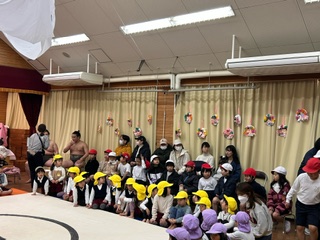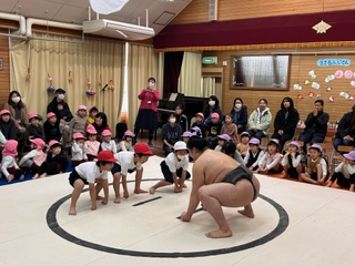 東小橋幼稚園さんにお邪魔させていただいて、お相撲さんとふれあっています。