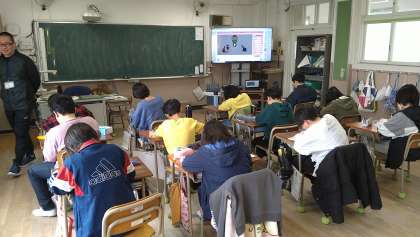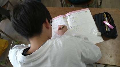 似ているアルファベットを書いています。子どもたちは英語の教科書「NEW