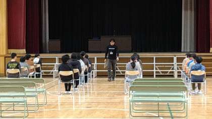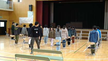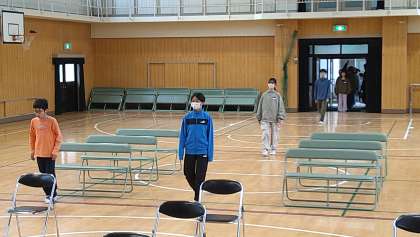 入場と退場を練習しています。担任からは、歩く時の前後の間隔を気をつけるようにと指示が出ています。