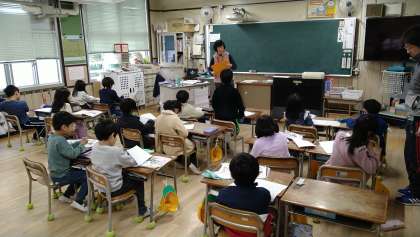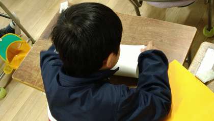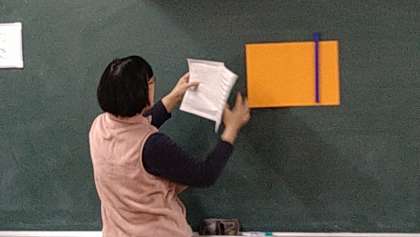 呼びかけのセリフを練習用するためのプリントを配り、台紙に貼っています。準備ができたら、呼びかけの練習をしています。
