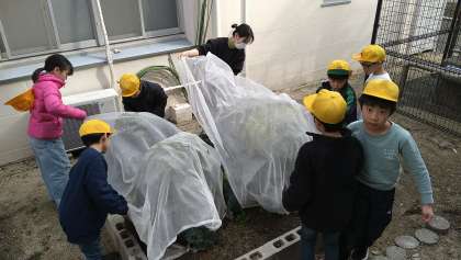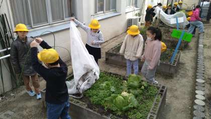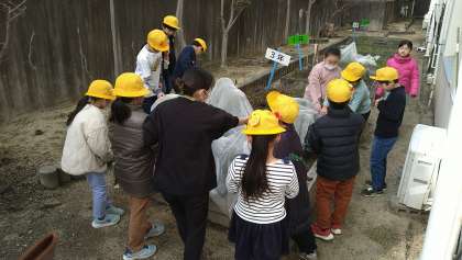 初めに寒さよけのネットと支柱を外しています。ネットを外すとブロッコリーが現れました。普段見れない花を見て「きれい。」と声が上がっています。