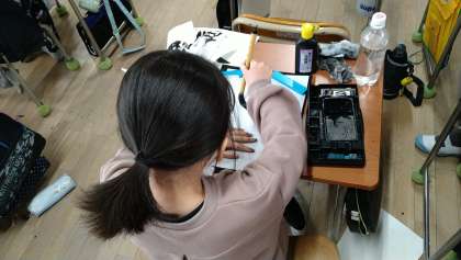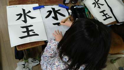 「とめ」・「はね」・「はらい」に注意して書くように指導しています。子どもたちからは、「水は書けたけど玉が書けない。」「上手く書けない。」「上手くできた。」とさまざまな声があがっています。