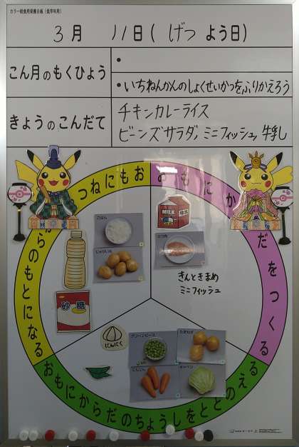 今日のメインは「チキンカレーライス」です。また、「ラッキーにんじんの日」となっており、「さくら」と「星」で型どられたにんじんが入っています。