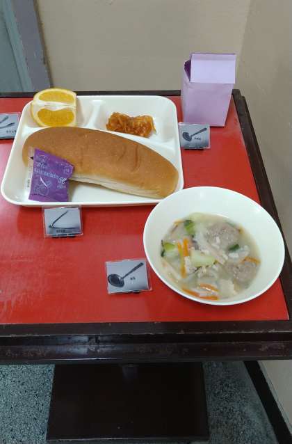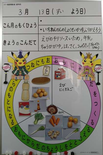 今日は、中華メニューとなっています。「えびのチリソースいため」「中華がゆ」にデザートの「はっさく」となっています。