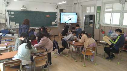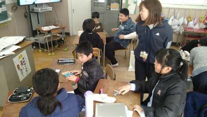 階段状になったマスにぴったりの文字数の言葉を書き込んでいきます。3名ほどでグループを作り、2分間の制限時間でおこなっています。