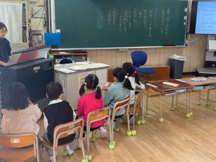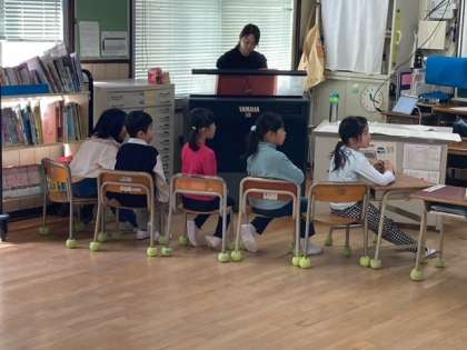 一年生が音楽の授業をしていました。「ちょうちょ」「チューリップ」「こうか」を歌っていました。はじめは少し声も小さかったですがどんどん元気な声が出てきていました。