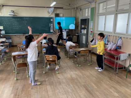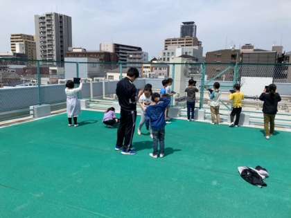 方位磁針の使い方を確認した後、屋上に出て、それぞれの方位に何が見えるか確認していました。