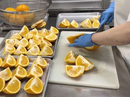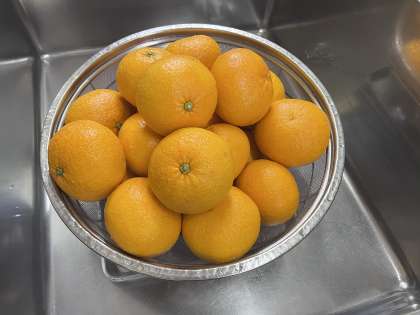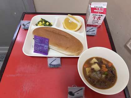 あまなつかんは、甘酸っぱく果汁がいっぱいでした。皮をむきやすいように、調理員さんが真ん中に切れ目を入れてくださっています。
