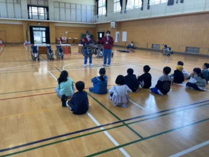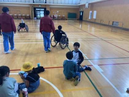 ちょっとした段差や坂道でも車いすに乗っていると感じが違いますよと教えていただいた後、実際に車いすを押してもらって校内を回ったり運動場に出たりしました。