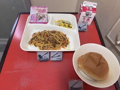 【ミニコッペパン、牛乳、ミートソーススパゲッティ、レタスとコーンのサラダ、いもけんぴフィッシュ】