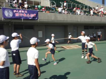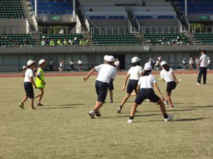 午前中は、他校の子どもたちと一緒に、ドッジボールをしたり、サッカーをしたりして交流しました。午後からは、100m走や400mリレー、400m走をしました。