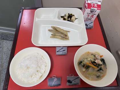 【ごはん、牛乳、きびなごてんぷら、みそ汁、わかたけ煮】
