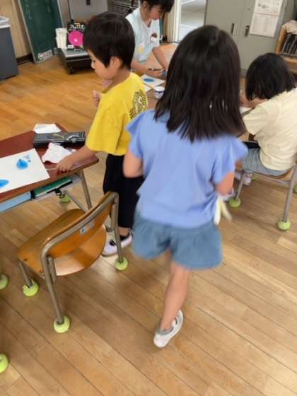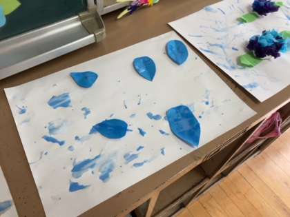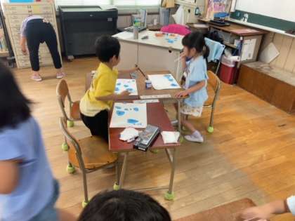 絵の具のしずくをストローで吹いて絵を描くブローイングをやっていました。