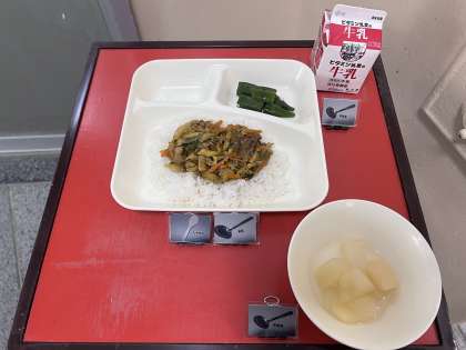【ごはん、牛乳、和風カレー丼、オクラのかつお梅風味、和なし(カット缶)】