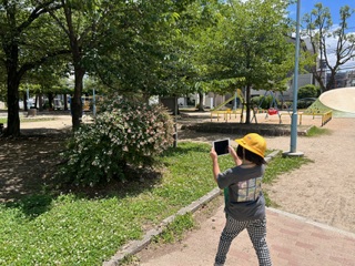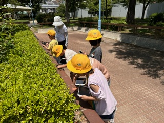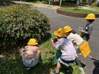 草花や虫たちの様子を見つけて、タブレット端末で撮影をしています。